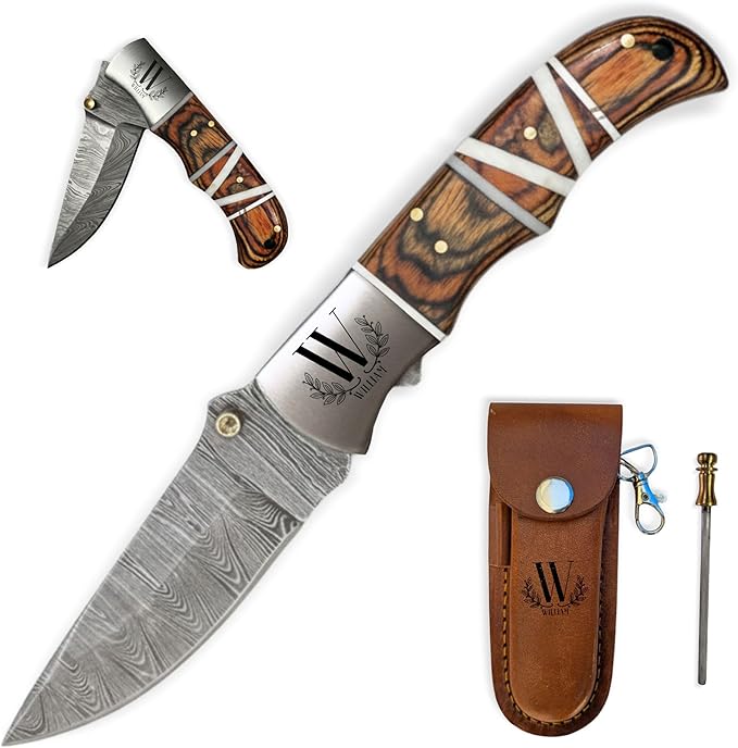 Personalized Vibsy Hub Pocket Knife - Custom Engraved Bolster, 3.5" Folding Knife Blade, Rosewood Handle, Leather Sheath, EDC Gift Knife for Men (BROWN)