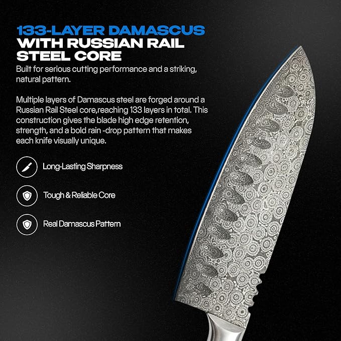 • This santoku knife is crafted with a 133-layer forged blade for strength and control, giving you a damascus knife that performs better than a standard chef knife or kitchen knife.
