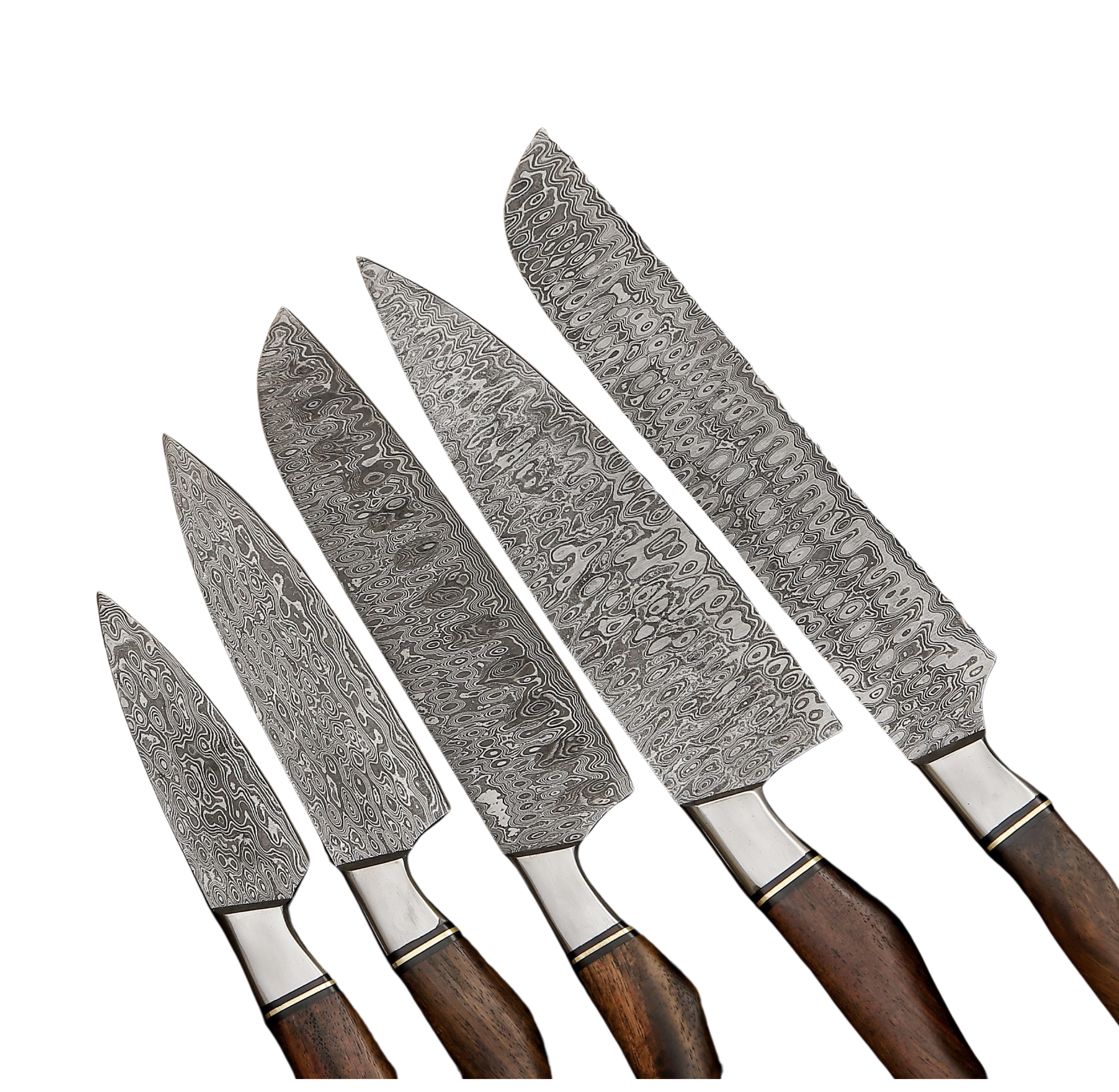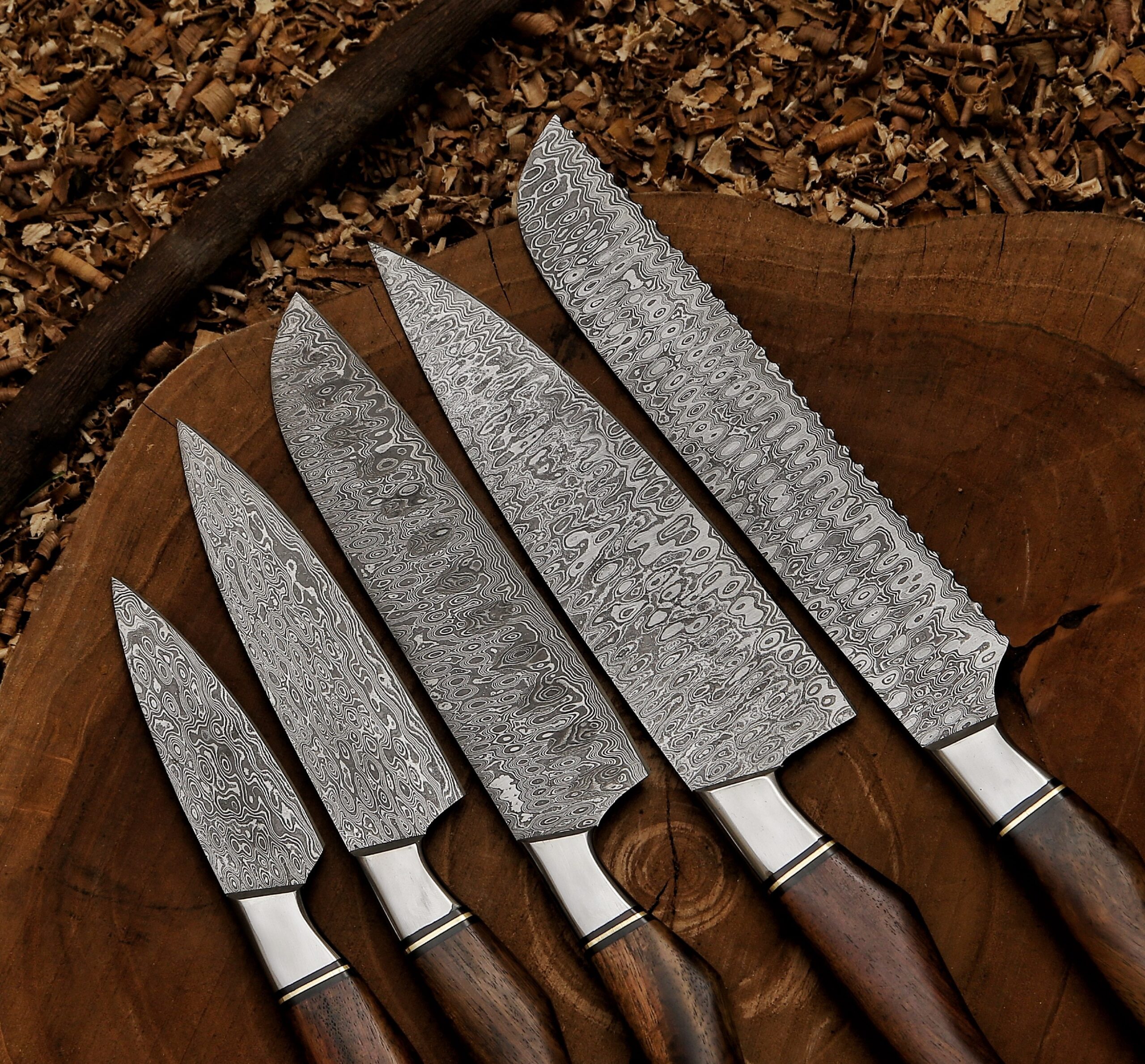 5 Pcs damascus kitchen knife set excels in daily tasks with cutting, chopping, and more. Crafted with advanced techniques, 12 processes, and a 15-degree edge for durability & sharpness. Set includes chefs, santoku, brisket bread, paring, and carving knives. Integrated blade, wood handle for perfect grip.