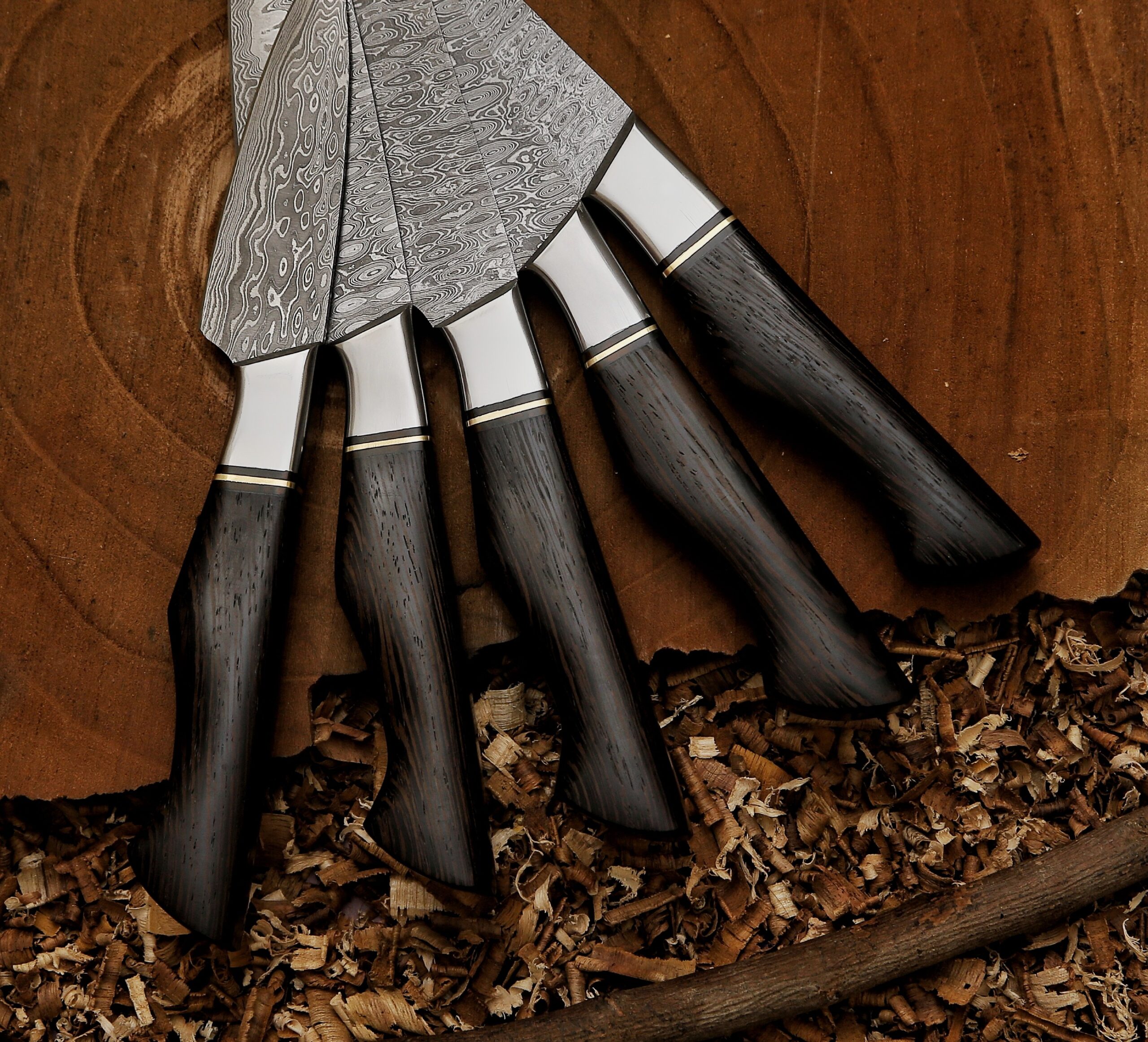5 Pcs damascus kitchen knife set excels in daily tasks with cutting, chopping, and more. Crafted with advanced techniques, 12 processes, and a 15-degree edge for durability & sharpness. Set includes chefs, santoku, brisket bread, paring, and carving knives. Integrated blade, wood handle for perfect grip.