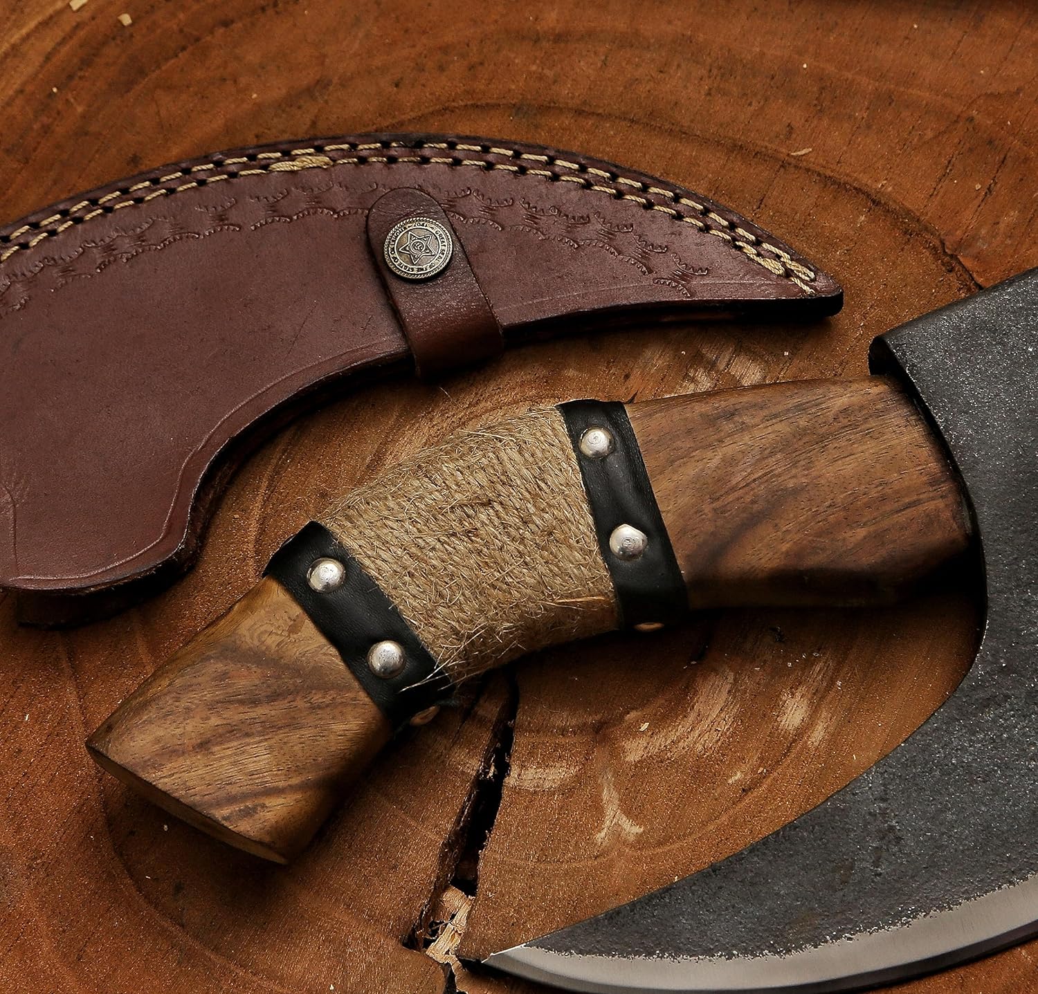 Includes a protective leather sheath, combining functionality and elegance to keep your pizza cutter axe safely stored.