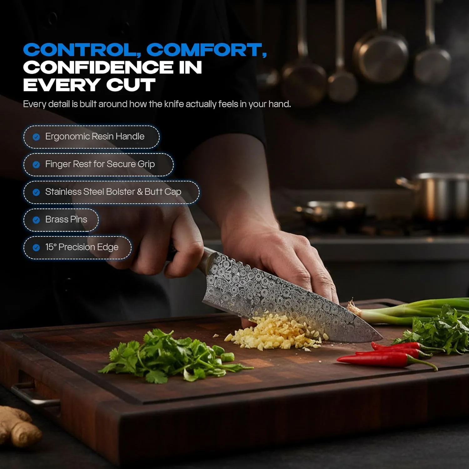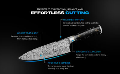 - The blade is finished at a precise 15° per side with a low-stick hollow edge, delivering clean cuts and efficient motion for damascus knife users and anyone who values sharp chef’s knives.